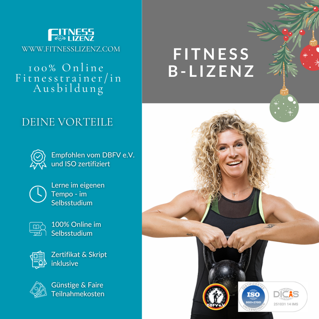Du möchtest andere Menschen auf ihrem Weg zu einem gesünderen und fitteren Leben unterstützen? Unser Online-Kurs zur Fitnesstrainer B-Lizenz ist der perfekte Einstieg in eine spannende und zukunftssichere Branche! In diesem Kurs lernst Du alle Grundlagen, die Du benötigst, um Deine Leidenschaft für Fitness in eine berufliche Perspektive zu verwandeln. Mit leicht verständlichen Inhalten, praxisnahen Übungen und einem klar strukturierten Aufbau bereiten wir Dich optimal auf Deinen Erfolg vor – und das alles in Deinem eigenen Tempo!